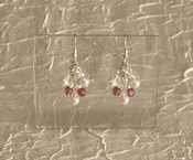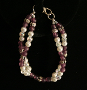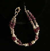 | This necklace has a double flower with mother of pearl pendant. Mother of pearl signifies faith, innocence,sincerity, and loyalty. This necklace has glass pearls, with silvertone metal flower beads and crystal beads with an aurora borealis finish. It also has lilac purple czech druk beads that are transparent. It also has a lobster clasp. |