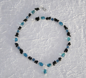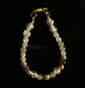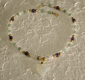 | This necklace has a white leaf pendant with a aurora borealis finish. It has crystal beads with aurora borealis finish. It has crystal beads with a AB finish. It also has green aventurine beads and amethyst beads. Green aventurine is the stone of luck it also has a stabilizing effect on the emotions. Amethyst encourages sobriety and inner peace. This necklace has a lobster clasp. |