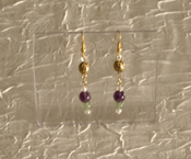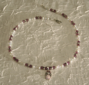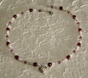 | This necklace has a heart metal pendant with crystals. It has lilac purple czech druk beads that are transparent. It also has pink transparent rainbow seed beads, and glass pearls. This necklace has amethyst glass faceted beads and silvertone spacers. The purple represents royalty and spirituality. The pink promotes love,self worth, and it helps with inner peace. This necklace has a lobster clasp. |