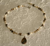 | This necklace has a tiger's eye teardrop pendant with tiger's eye round beads and chips. Tiger's eye heightens concentration and it can ease headaches. It is also a healing stone for bronchial problems and asthma. This necklace has rice fresh water pearls. Pearls promote wisdom and happiness. It also has silvertone metal bead caps & a lobster clasp. |