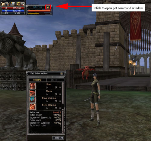 When a pet is summoned and spends time with the character its compatibility level increases. The more time the pet spends summoned, the hungrier it gets. You can check your pet’s hungriness and compatibility level while your pet is summoned in the pet’s status window. These values play the following roles: